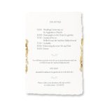 Elegant wedding invitation detail card in white with gold elements. Detail card with hand-torn edges. Minimal and elegant design. The edges of the card are decorated with gold foil, the text and branch motif are printed in black.