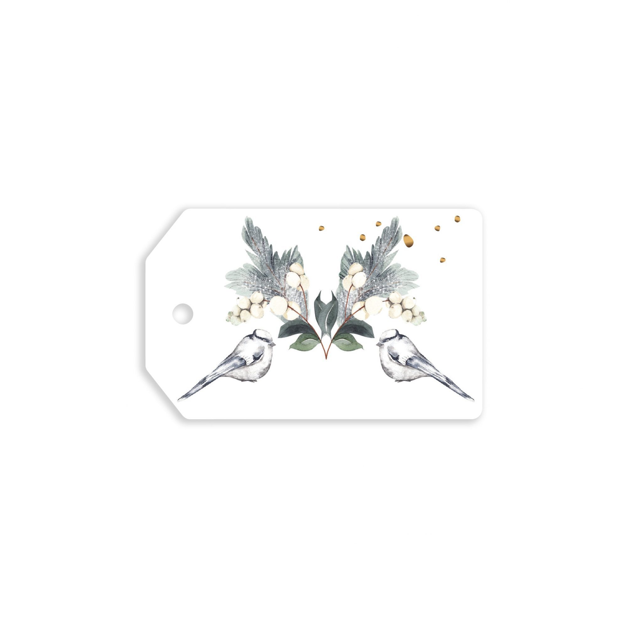 Gift tag with two birds in watercolor technique and golden elements created in relief printing.