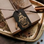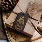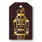 A gift tag in dark brown color with a gold design made in relief print.