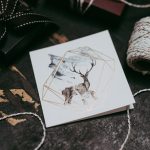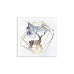 Opening Christmas greeting card with an illustration of a deer created in watercolor technique, complemented by an abstract, geometric golden frame printed in relief printing. The card is made on beautiful white textured paper, the inside is empty so you can write your wish.