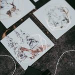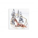Opening Christmas greeting card with an illustration of a fox created in watercolor technique, complemented by an abstract, geometric golden frame printed in relief printing. The card is made on beautiful white textured paper, the inside is empty so you can write your wish.