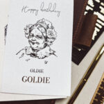 Single-sided greeting card with illustration and text "happy birthday oldie " and gold text "goldie" printed in relief. The other side of the card is blank so you can write your wish.