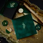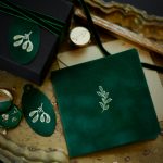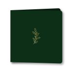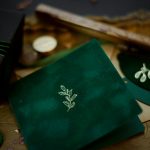 Opening Christmas greeting card with a mistletoe design printed in gold embossing on a rich dark green background.