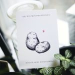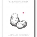 One-sided greeting card with rounded corners in white color, the text "Love you more than potatoes" and a pink foil heart element printed in relief printing. The other side is blank so you can write your wish.