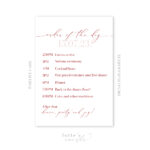 Wedding invitation day plan card in red and white tones. Classic, rectangular shape. Different fonts used - classic and calligraphic.
