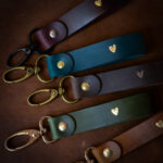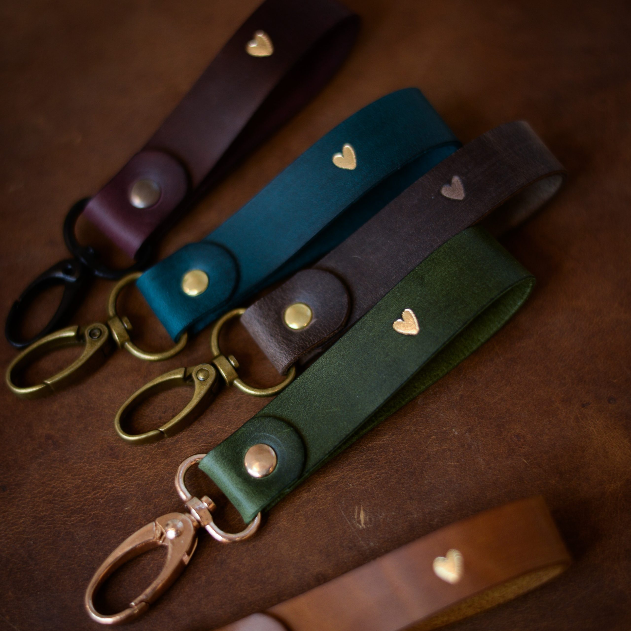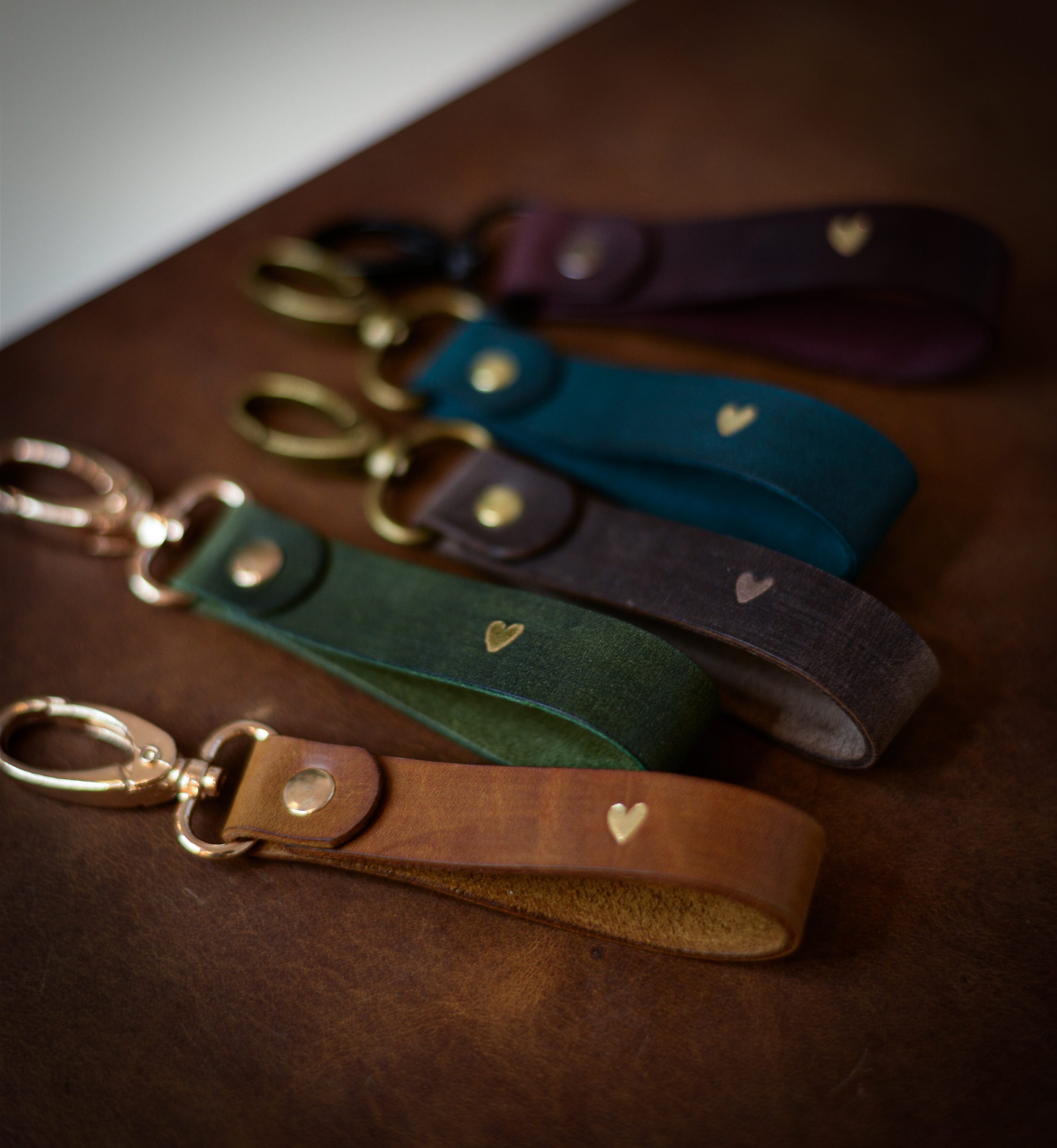High-quality leather pendant in various colors with a printed heart symbol in gold.