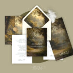 The invitation can be complemented with a detail card, envelope, RSVP, menu, place cards, etc. in a matching style.