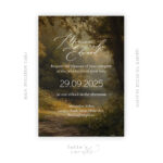 An elegant wedding invitation's main card with dreamy forest painting printed in the background, and white text elements.