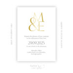 An elegant wedding invitation's main card with decorative typography in minimalist style in white and grey tones with luxurious gold embossed initials.