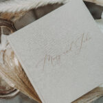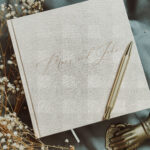 The book is meticulously handmade, neatly bound in sturdy covers, covered with a linen-like textured material, which makes it particularly pleasant to the touch. Personalize with words of your choice printed in beige/sand tone. The cover material tone used in the title image is "light porcelain". This design includes 2 words.