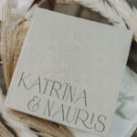 The book is meticulously handmade, neatly bound in sturdy covers, covered with a linen-like textured material, which makes it particularly pleasant to the touch. Personalize with words of your choice printed in a green tone. The cover material tone used in the title image is "light porcelain". This design includes 2 words and an "&" symbol.