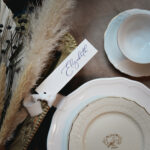 Romantic style place card in white or pastel green. Sturdy paper. Minimal and elegant design. Place card with the guest's name printed in black or white, in a calligraphic font. A white, hand-torn ribbon is attached to the end of the card.
