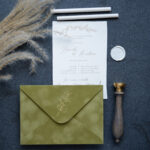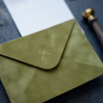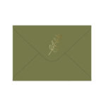 An olive green velvet paper envelope with a eucalyptus motif printed in gold foil will dress up your chosen greeting card, note or letter so that it can be delivered safely and beautifully to the recipient.