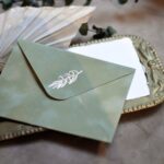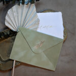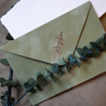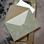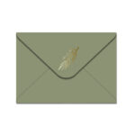 A velvet paper envelope in light olive green with an olive branch motif printed in gold foil will dress up your chosen greeting card, note or letter so that it can be delivered safely and beautifully to the recipient.