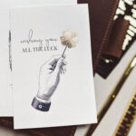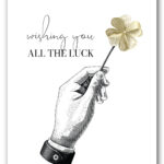 Vienpusēja apsveikuma kartīte ar ilustrāciju un tekstu "wishing you all the luck" un zelta četrlapiņu iespiestu reljefspiedē. Otra kartītes puse ir tukša, lai vari uzrakstīt savu vēlējumu.