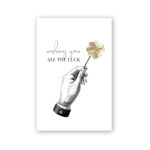 Vienpusēja apsveikuma kartīte ar ilustrāciju un tekstu "wishing you all the luck" un zelta četrlapiņu iespiestu reljefspiedē. Otra kartītes puse ir tukša, lai vari uzrakstīt savu vēlējumu.