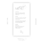 Izsmalcināta kāzu vakariņu ēdienkarte ar dekoratīvu tipogrāfiju, veidota atturīgā minimālisma stilā. Lieliski papildinās klasiskas un elegantas svinības.