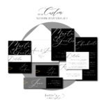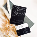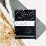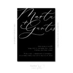 Kāzu ielūguma galvenā kartīte melnā krāsā ar baltas krāsas druku. Minimālistisks dizains, melnbalti toņi, vienotas formas. Kaligrāfiska stila fonta akcenti apvienojumā ar klasiska stila fontiem, modernam un romantiskam izskatam.