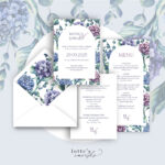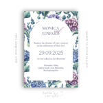 Eleganta kāzu ielūguma galvenā kartīte ar bagātīgu, krāšņu hortenziju motīvu fonā.