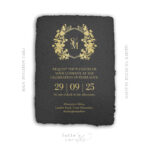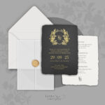 Eleganta un grezna kāzu ielūguma galvenā kartīte no melna rokām lieta papīra, ar zelta tekstu un ziedu ģērboni ar pāra iniciāļiem. Ļoti īpašai un izsmalcinātai kāzu noskaņai.