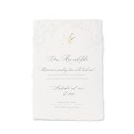 Minimāls un elegants dizains. Kāzu ielūguma galvenā kartīte baltos un pelēkos toņos. Rokām plēsts papīrs, pāra iniciāļi reljefspiedes tehnikā ar zelta foliju, kaligrāfiska stila teksts, elegants zaru motīvs.