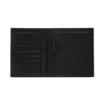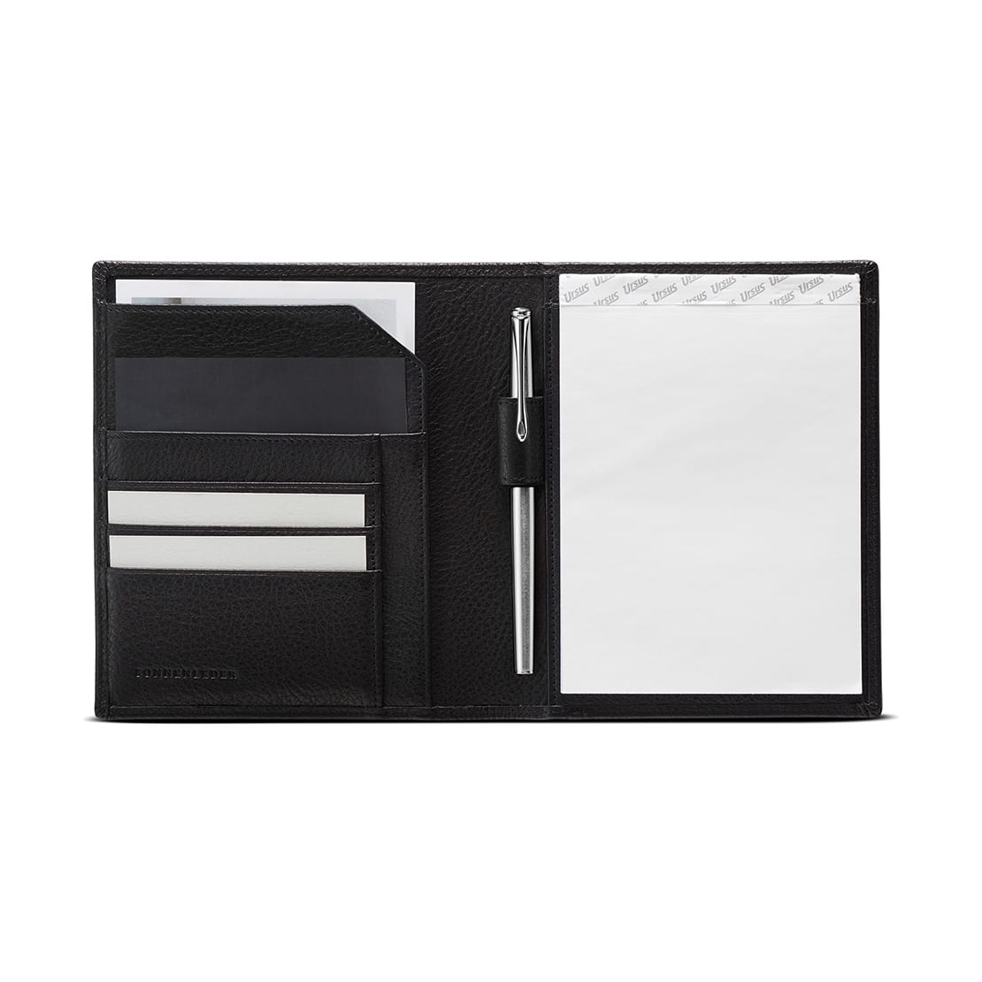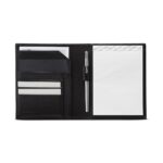 A6 izmēra ādas dokumentu mape melnā krāsā. Mapē ietilpst vieta vizītkartēm, piezīmju lapām, pildspalvai un nodalījums, kurā ievietot piezīmju grāmatu.