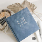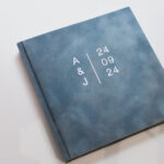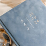 Viesu grāmata elegantos samta papīra vākos, kuru personalizēsim ar vertikāli novietotiem pāra iniciāļiem un nozīmīgo datumu, kā redzams paraugā, zeltā vai sudrabā. Akurāts un rūpīgs roku darbs ar elegantu un karalisku noskaņu - perfekti papildinās Jūsu kāzas vai īpašo notikumu. Pieskaņo arī laulību vākus vai zvērestu grāmatiņas.