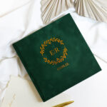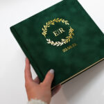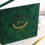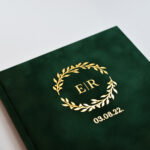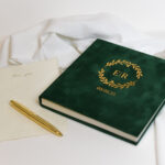 Viesu grāmata elegantos samta papīra vākos, kuru personalizēsim ar greznu vainagu, pāra iniciāļiem un nozīmīgo datumu, kā tas redzams paraugā, zeltā vai sudrabā. Akurāts un rūpīgs roku darbs ar elegantu un karalisku noskaņu - perfekti papildinās Jūsu kāzas vai īpašo notikumu. Pieskaņo arī laulību vākus vai zvērestu grāmatiņas.