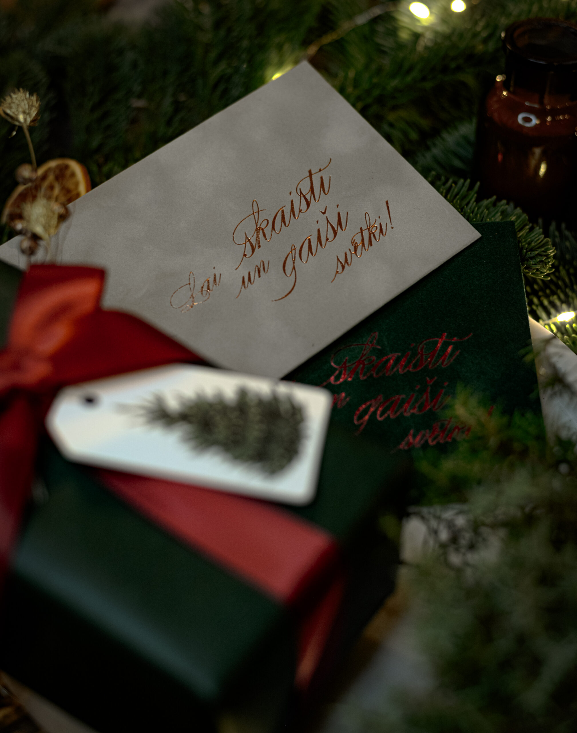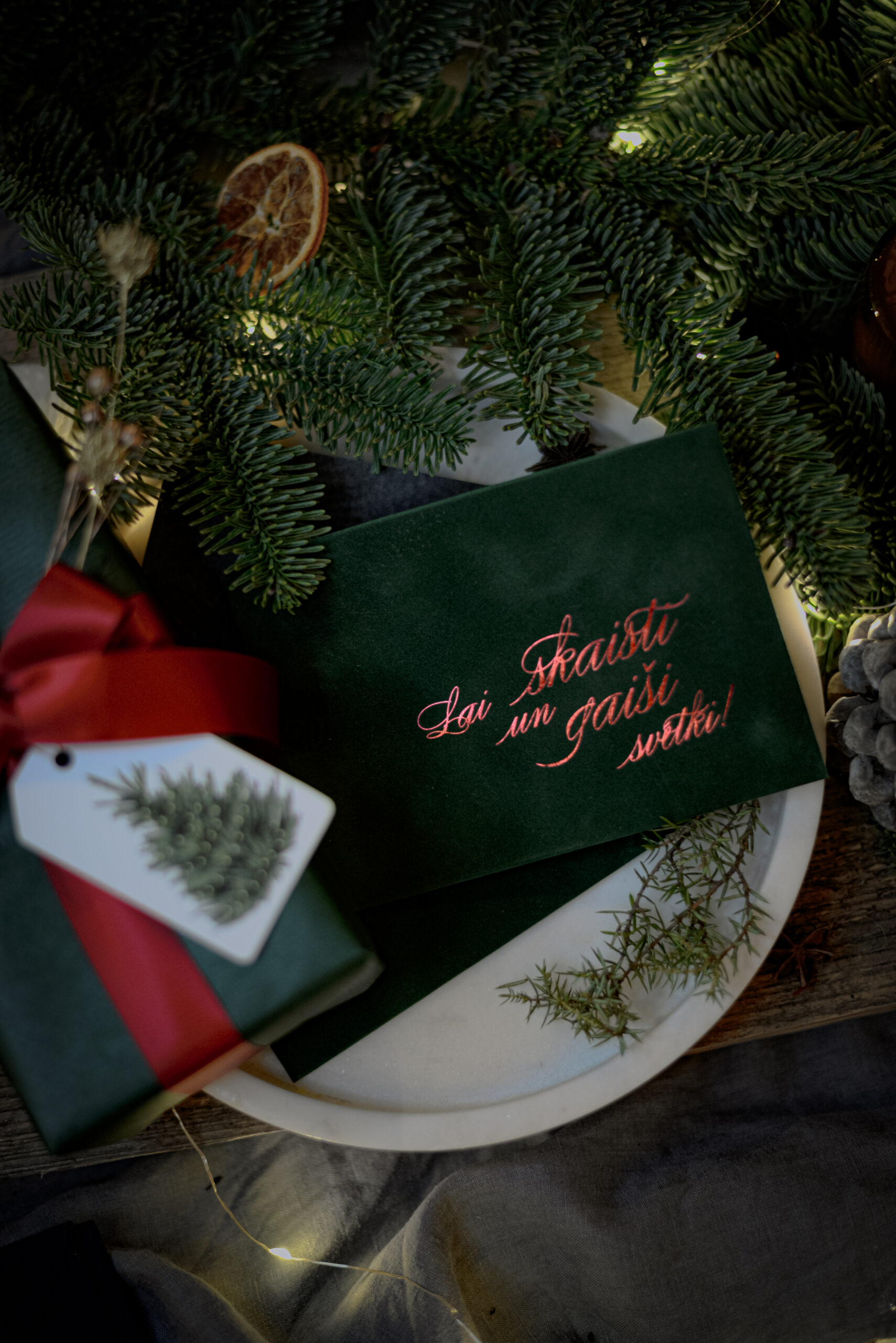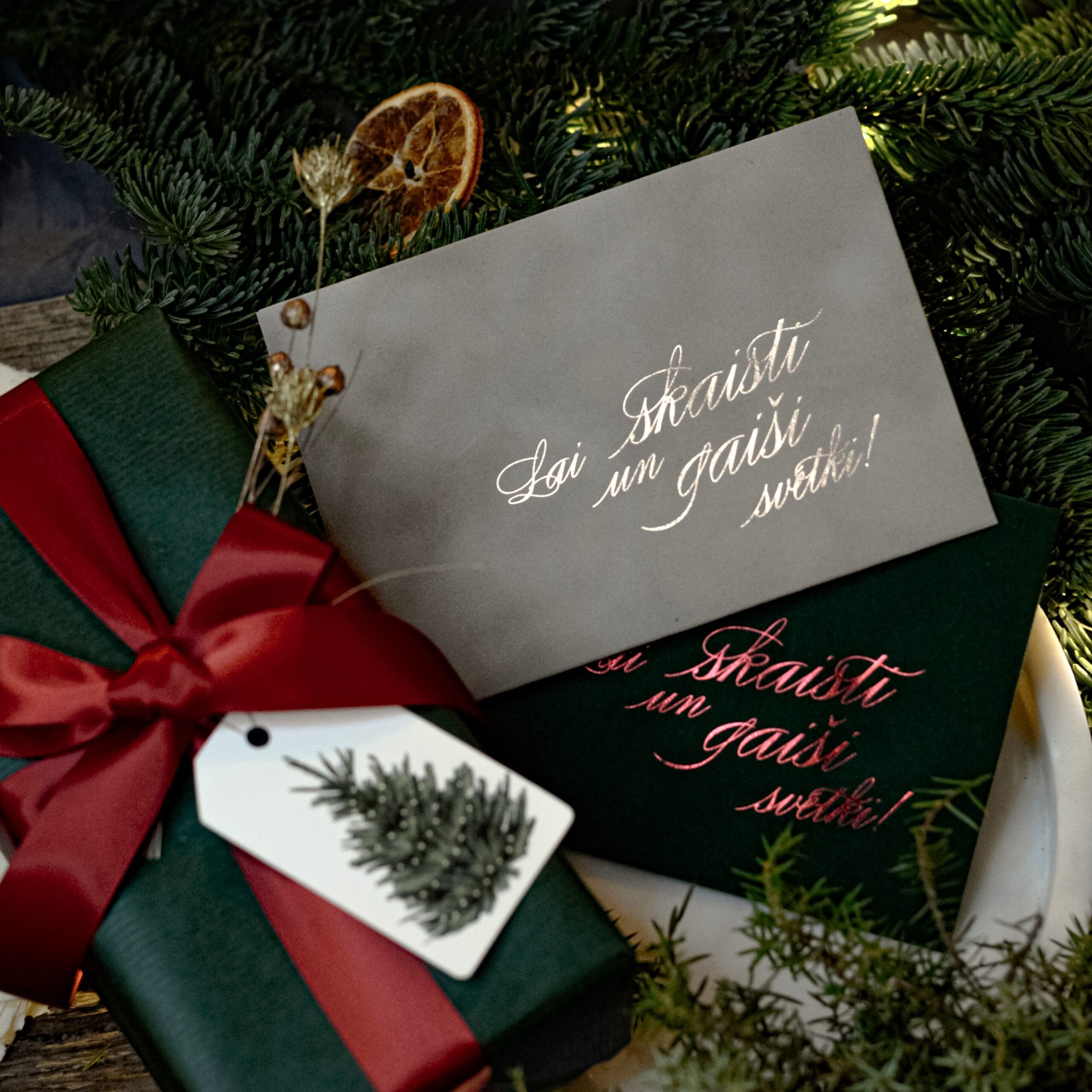 Samta papīra aploksne ar Ziemassvētku motīvu iespiestu folijspiedē, ietērps Tavu izvēlēto apsveikuma kartiņu, zīmīti vai vēstuli, lai to droši un skaisti vari nogādāt pie saņēmēja.