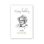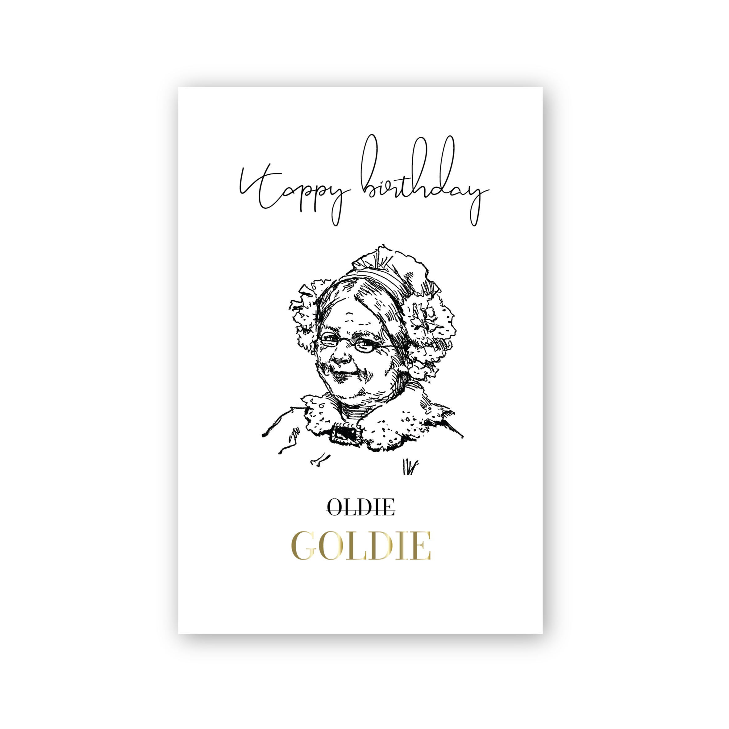 Vienpusēja apsveikuma kartīte ar ilustrāciju un tekstu "happy birthday oldie " un zelta tekstu "goldie" iespiestu reljefspiedē. Otra kartītes puse ir tukša, lai vari uzrakstīt savu vēlējumu.