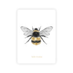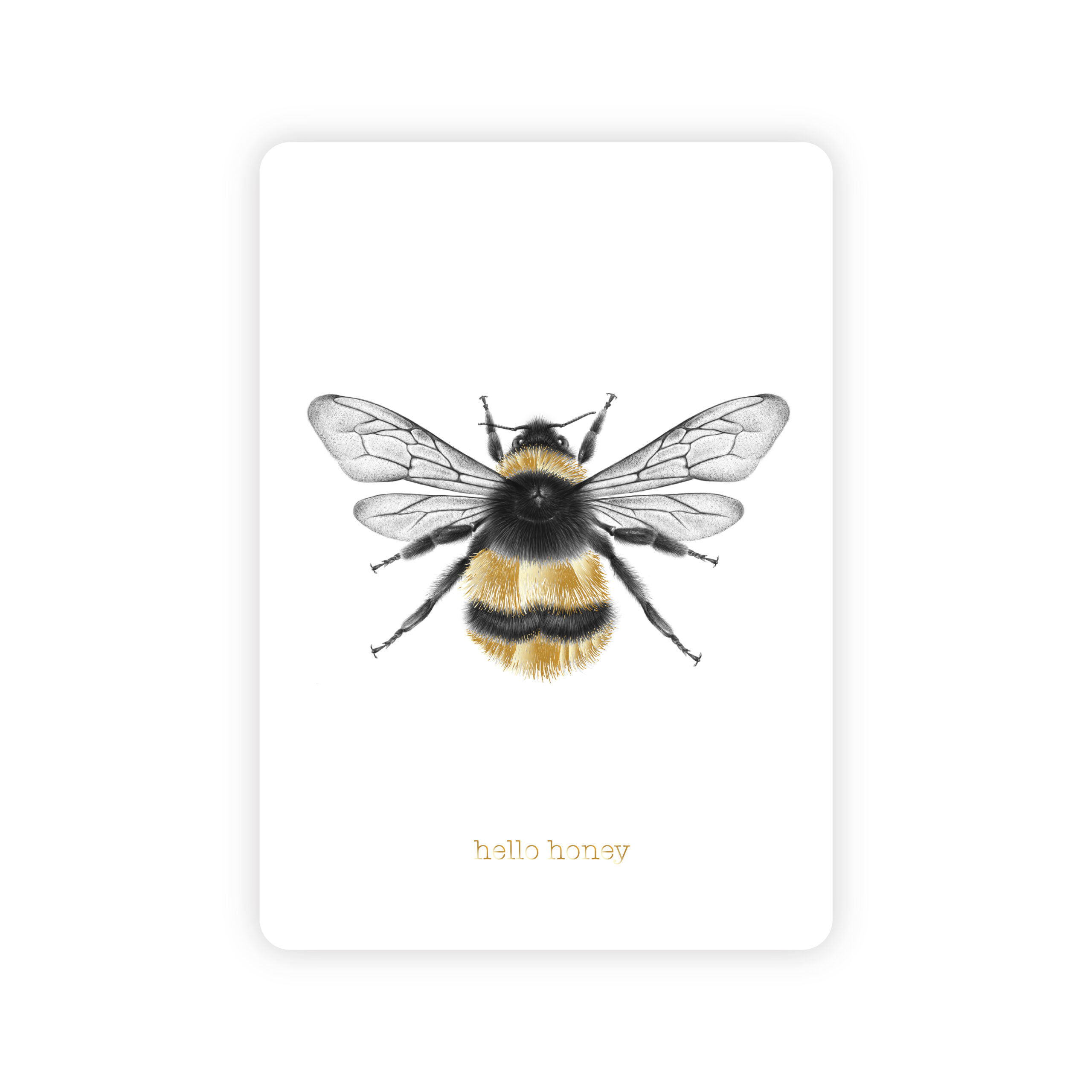 Vienpusēja apsveikuma kartīte baltā krāsā, noapaļotiem stūriem ar mākslinieces Ilonas Kaķītes bites ilustrāciju un tekstu "hello honey". Teksts un ilustrācijas detaļas iespiestas zelta reljefspiedē. Otra kartītes puse ir tukša, lai vari uzrakstīt savu vēlējumu.
