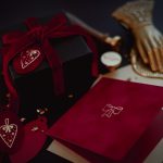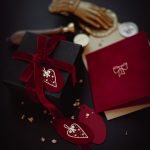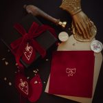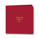 Atverama Ziemassvētku apsveikuma kartīte ar lentes dizainu drukātu zelta reljefspiedē uz piesātināta koši sarkana fona.
