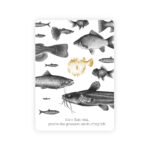 Vienpusēja apsveikuma kartīte baltā krāsā, noapaļotiem stūriem ar mākslinieces Ilonas Kaķītes zivju ilustrācijām, tekstu "It's o-fish-cial, you're the greatest catch of my life" un kartītes centrā iespiestu dizainu zelta reljefspiedē. Otra kartītes puse ir tukša, lai vari uzrakstīt savu vēlējumu.