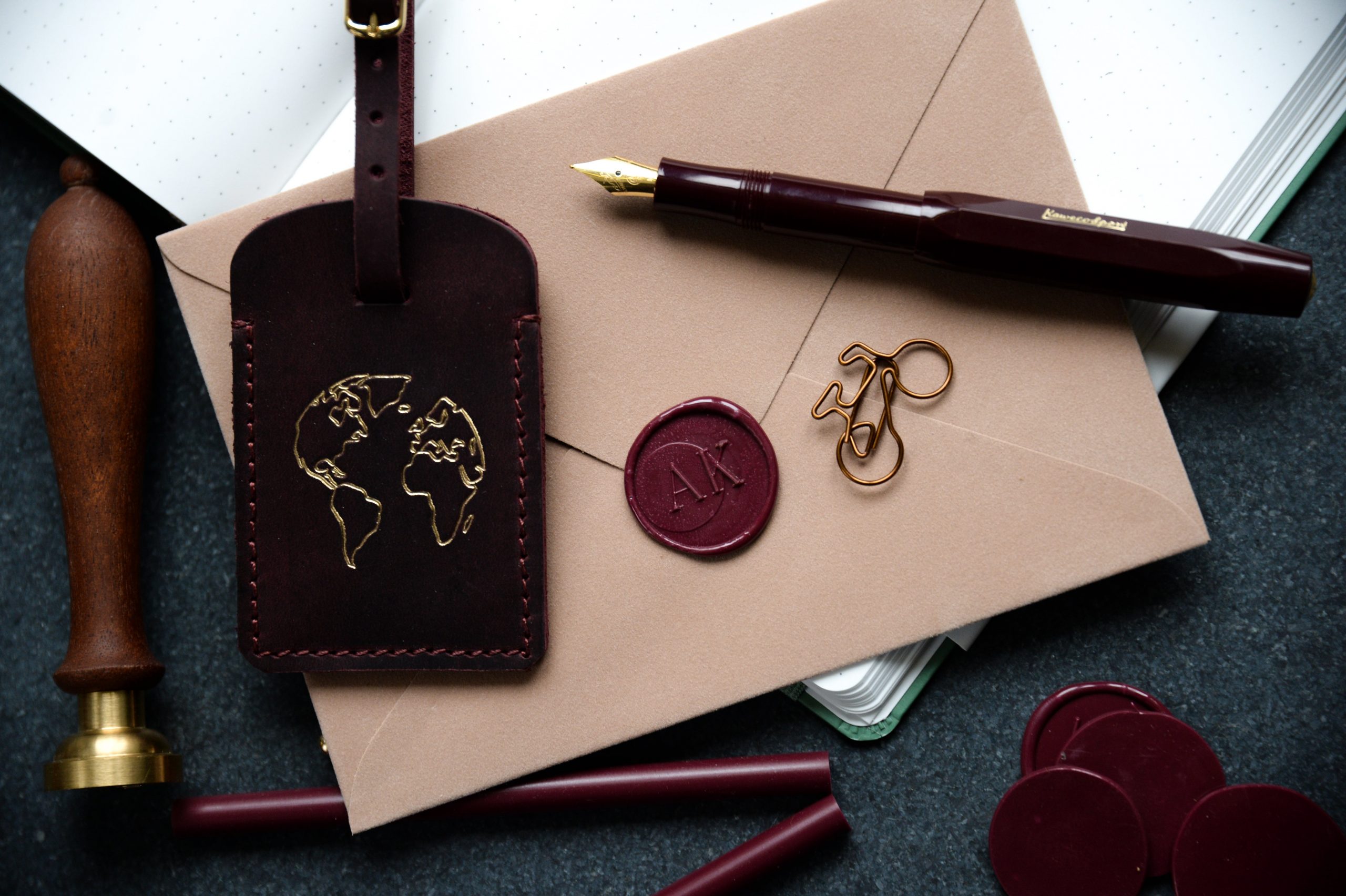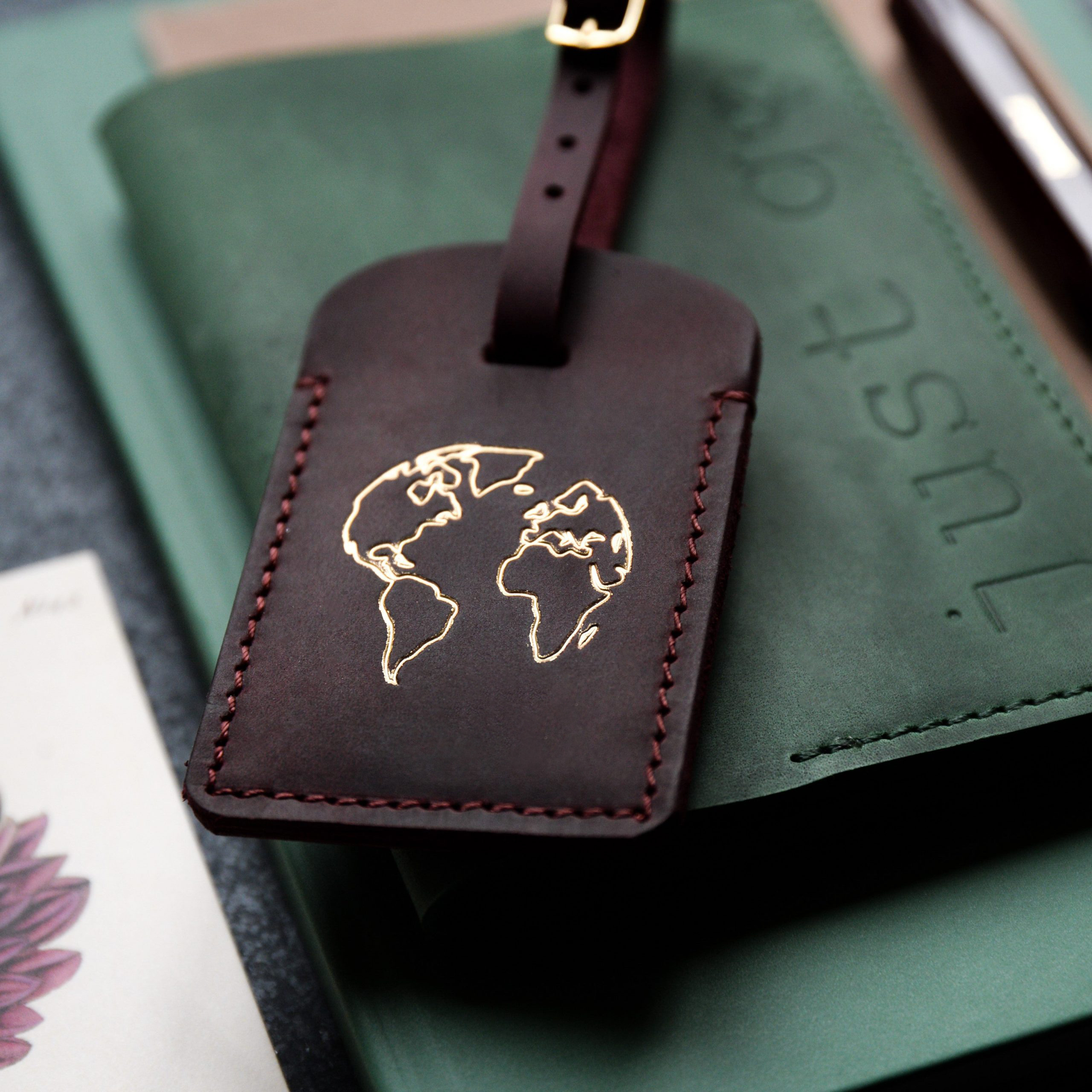 Bagāžas piespraude no kvalitatīvas ādas ar ādas lentīti un sprādzi. Piespraudē iespiests pasaules kartes siluets zelta krāsā. Bagāžas piespraudē ievietota apdrukāta lapiņa, kurā var ierakstīt informāciju par bagāžas īpašnieku, lai to ir vieglāk atrast nozaudēšanas gadījumā.