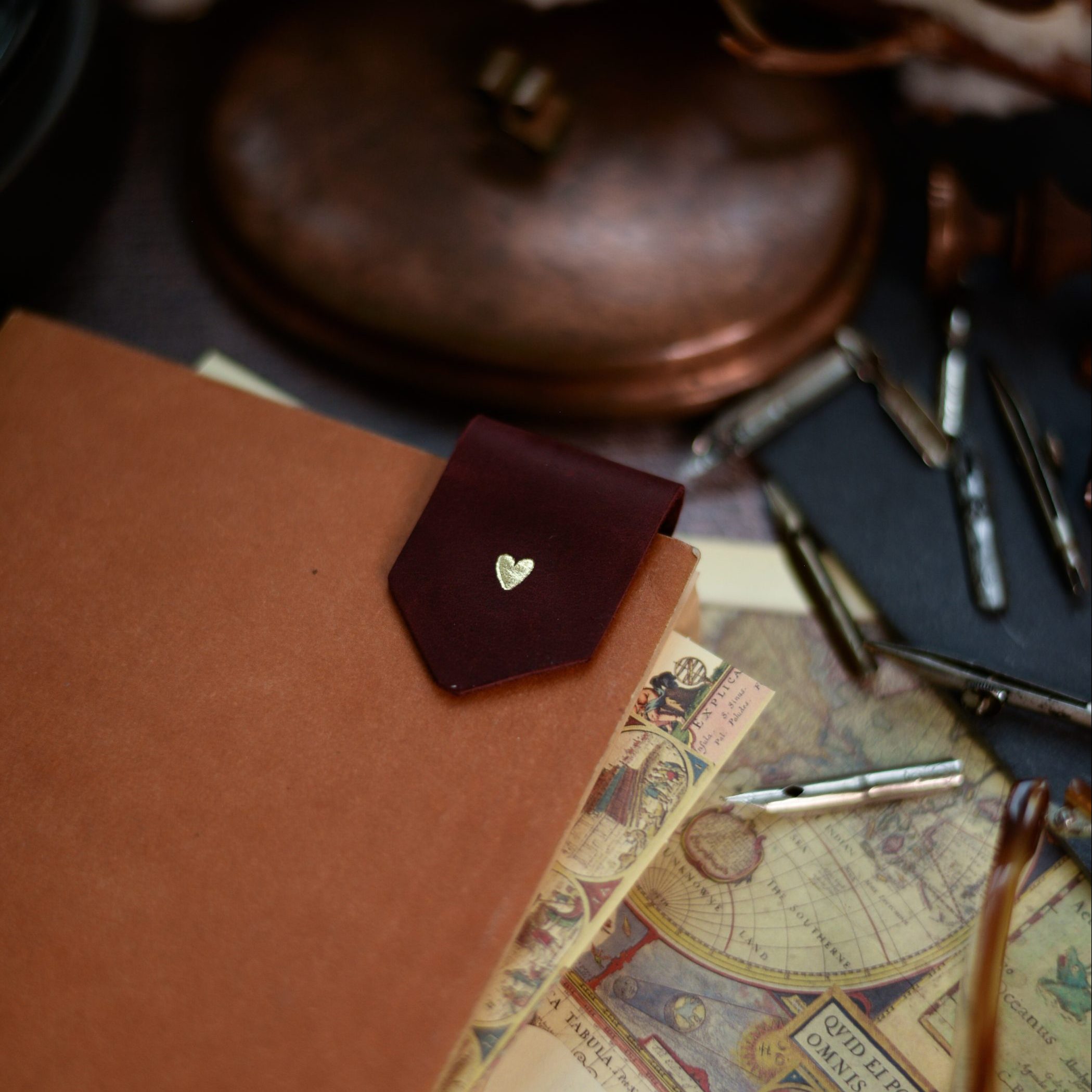 Dabīgas ādas grāmatzīme ar magnētiem un reljefā iespiestu sirds dizainu " ♥ ". Ņemot vērā tās formu un izmēru, grāmatzīme būs piemērota jebkura izmēra grāmatai vai plānotājam.